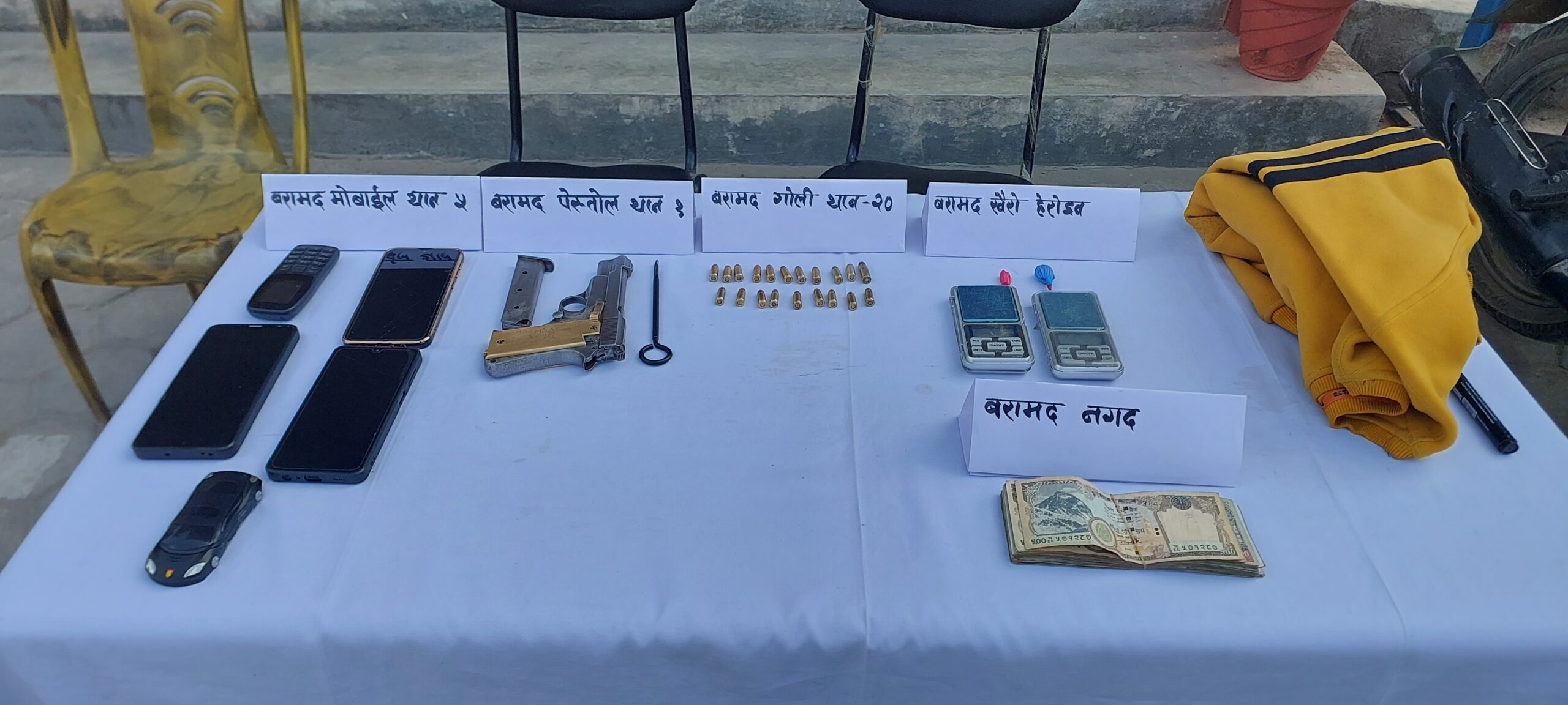जिल्ला प्रहरी कार्यालय मकवानपुरका प्रमुख प्रहरी नामयव उपरिक्षक सीताराम रिजालका अनुसार उनीहरुको साथबाट सेमि–अटोमेटिक पेस्तोल, २० राउण्ड गोली, हतियार सफा गर्ने रड, लागु औषध खैरो हेरोईन २ ग्राम ४०० मिलिग्राम, लागु औषध तौल गर्ने डिजिटल तराजु २ थान, ५ थान मोबाईल, ५० हजार नगद र ना २५ प ३३०५ नम्बरको सिवि युनिकर्न र ना ६३ प ९६७८ नम्बरको आरआर ३१० सिसिको मोटरसाइकल बरामद गरेको छ ।
