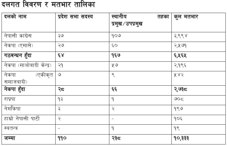 बागमती प्रदेशमा एमाले, माओवादी केन्द्र र एकीकृत समाजवादीसहित गठबन्धन कायम रहे उनीहरूको पक्षमा कुल मतभार ५ हजार ३०९ पुग्छ ।